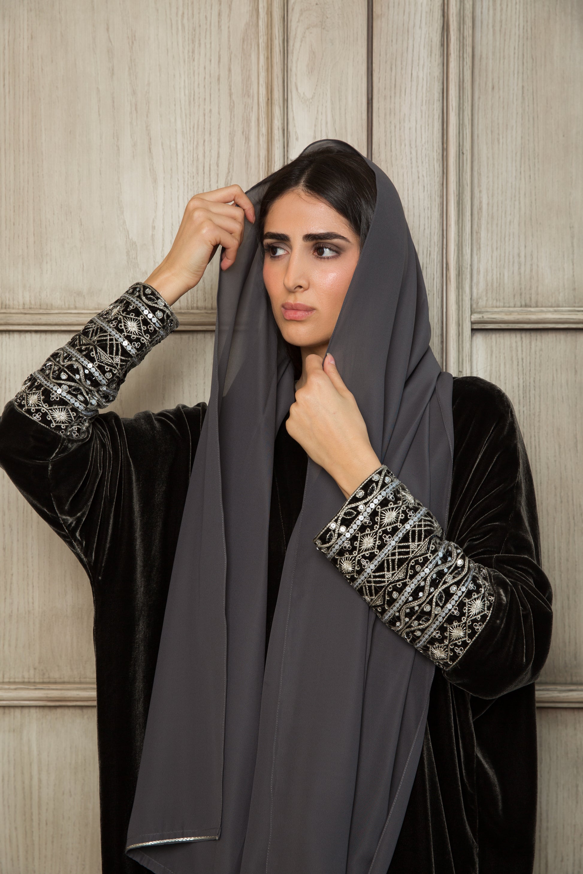 - Luxurious dark grey velvet abaya, exuding opulence and sophistication with its rich and vibrant colour.