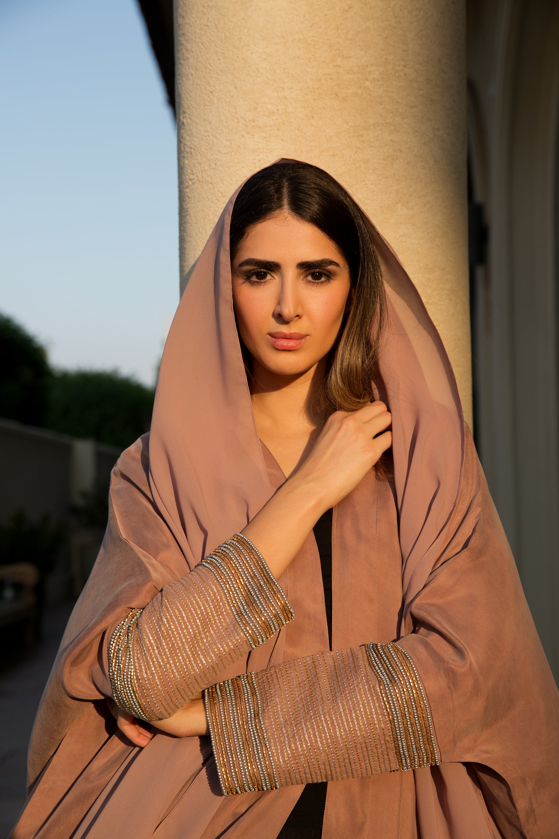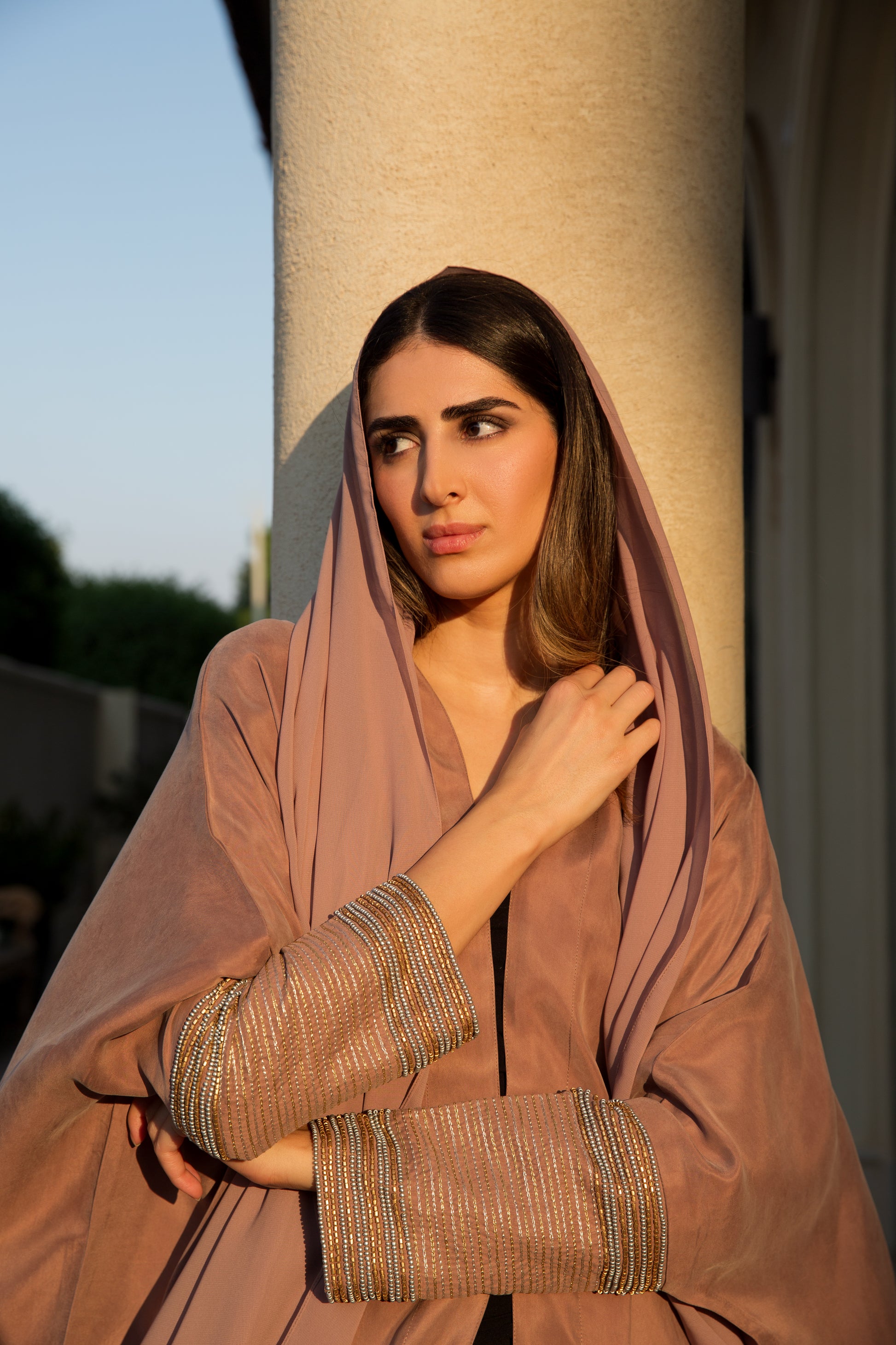 - The soft dusty pink hue exudes a sense of warmth and tranquility, adding a delicate charm to the abaya.