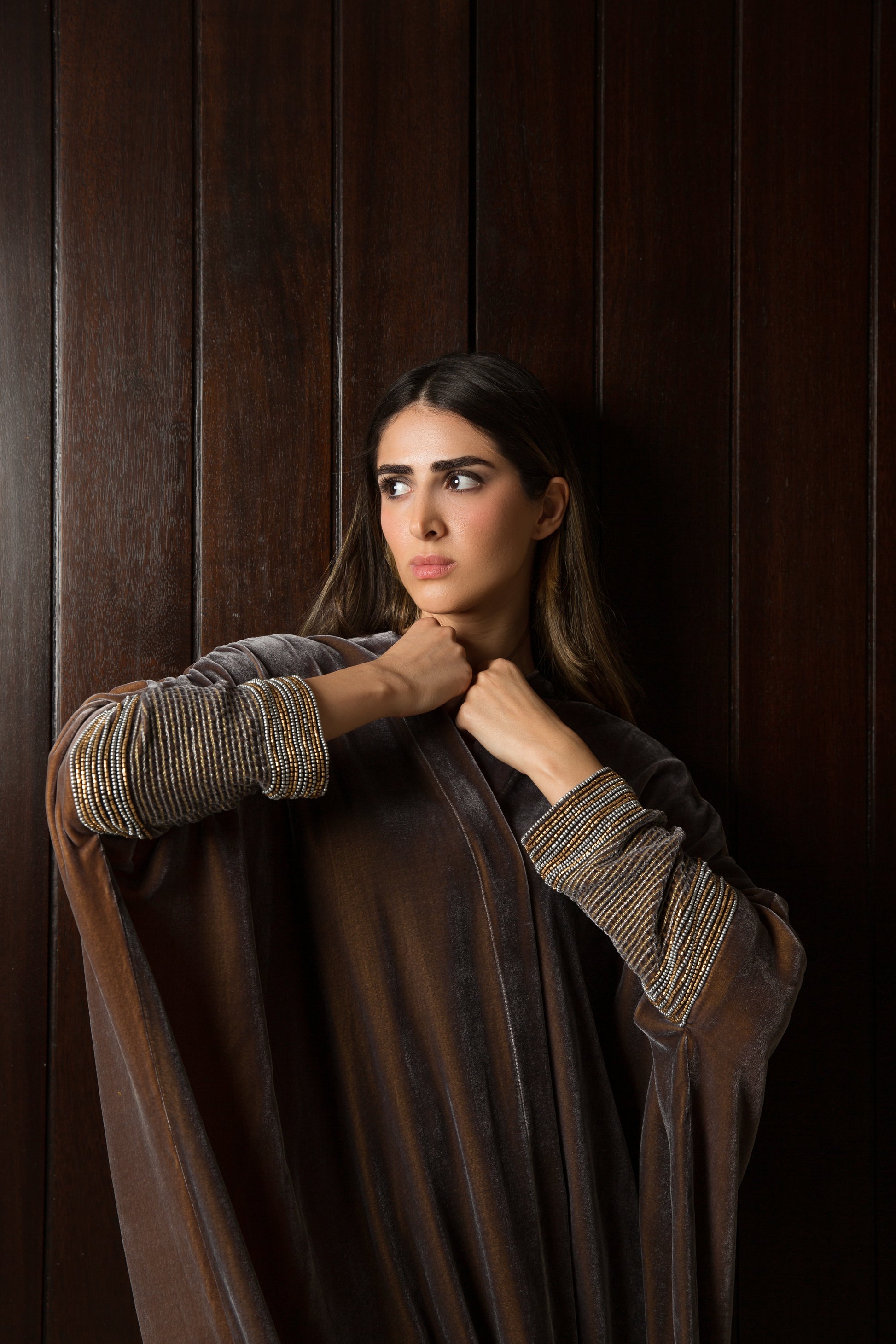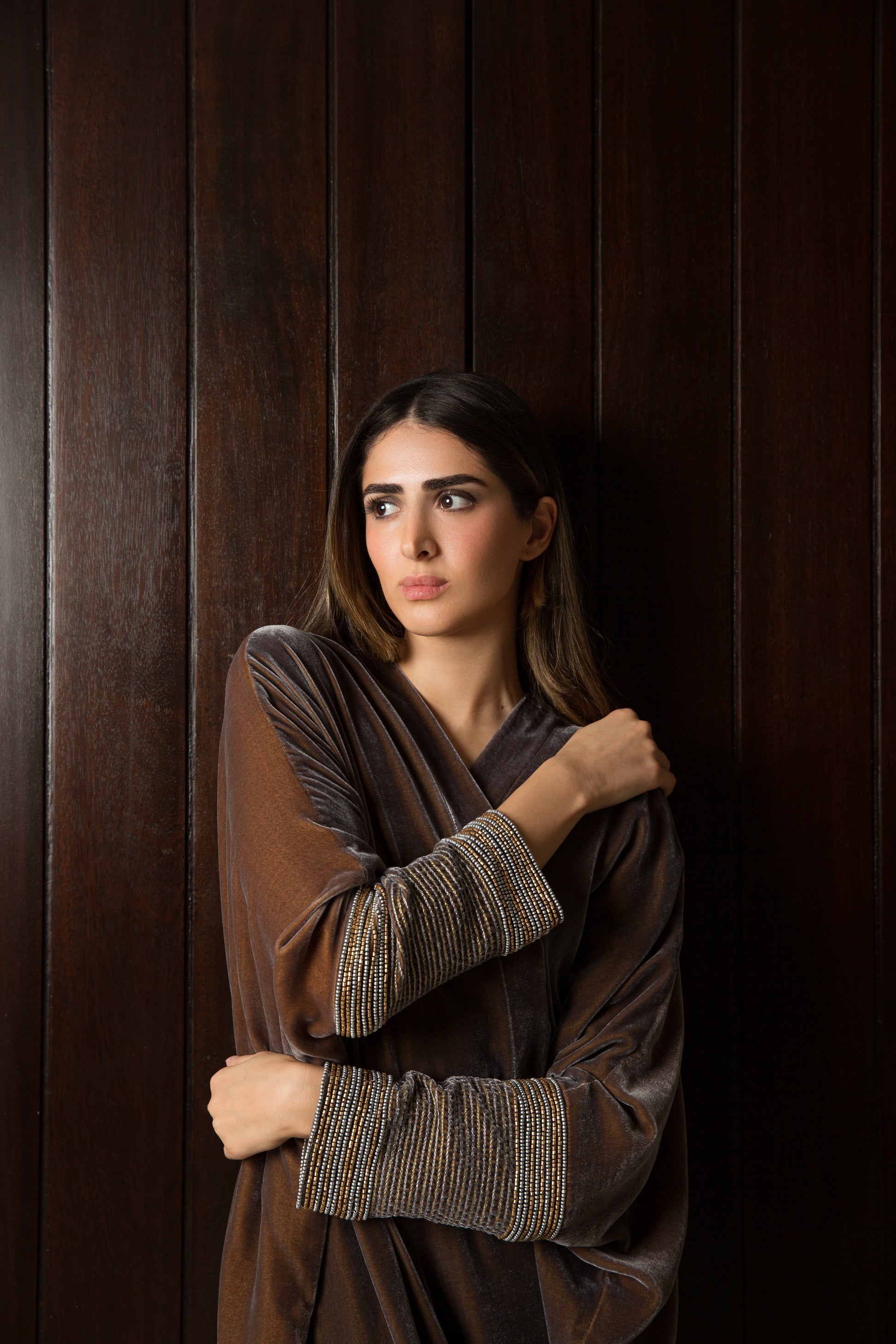 - Luxurious brown velvet abaya, exuding opulence and sophistication with its rich and vibrant colour.