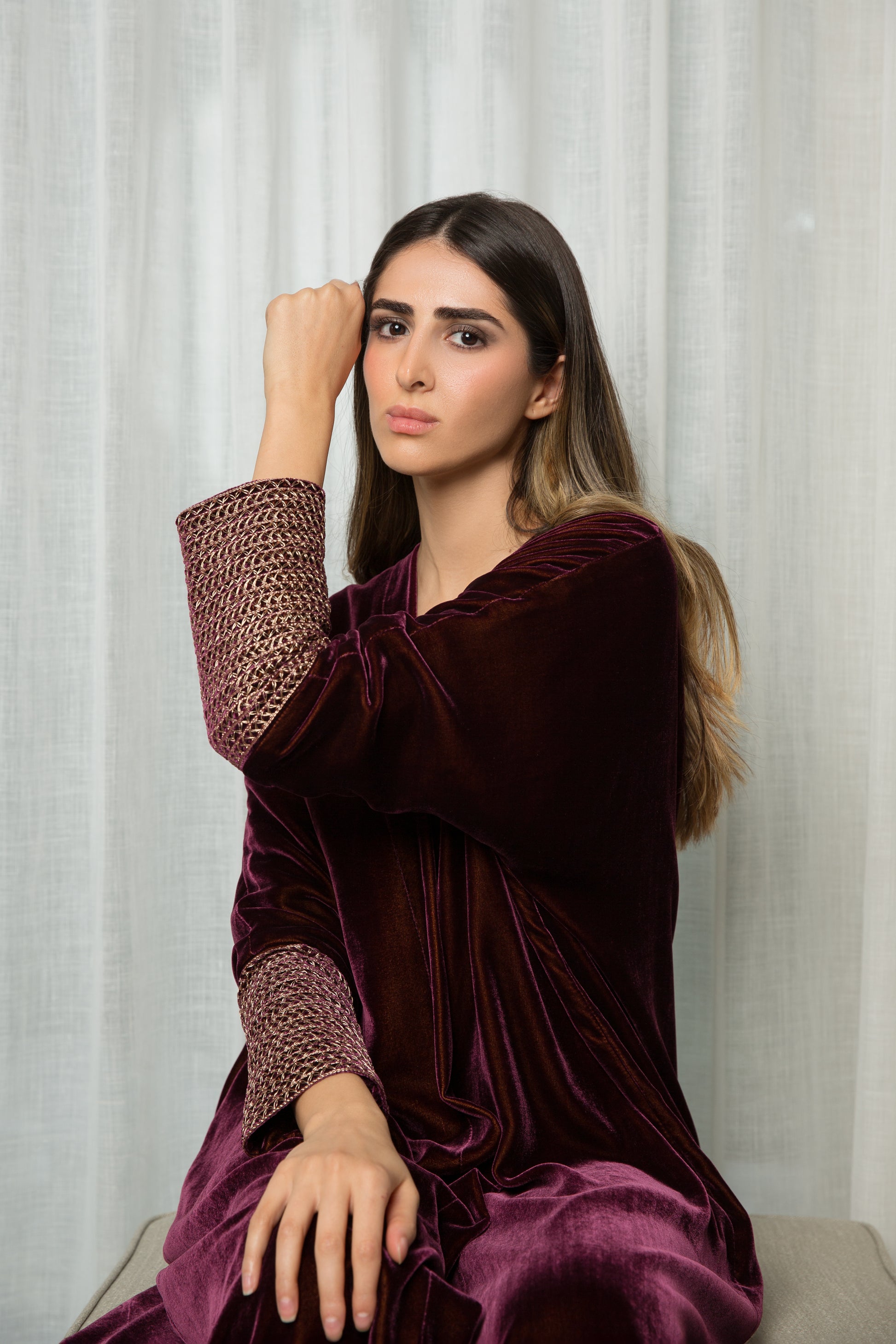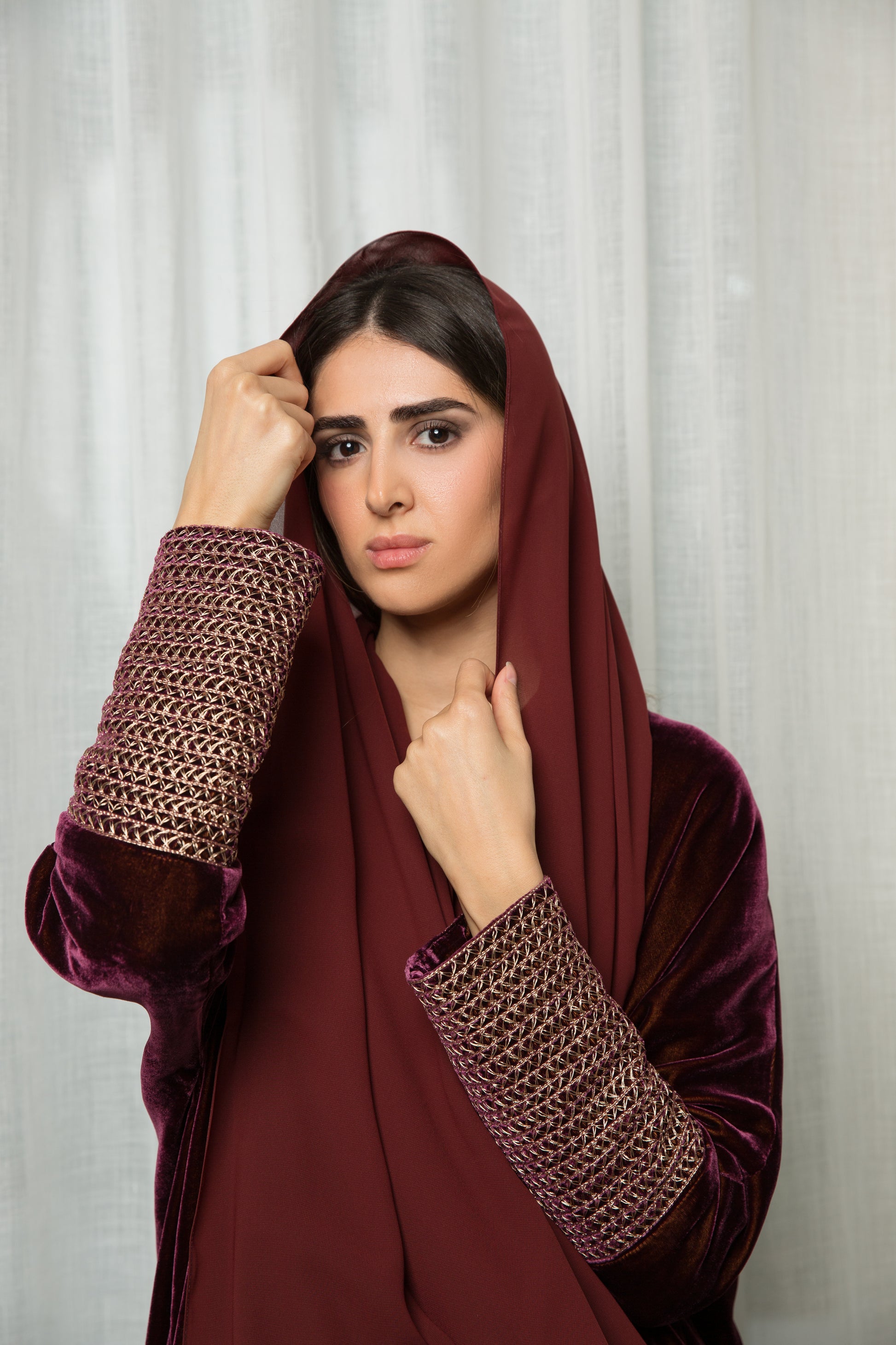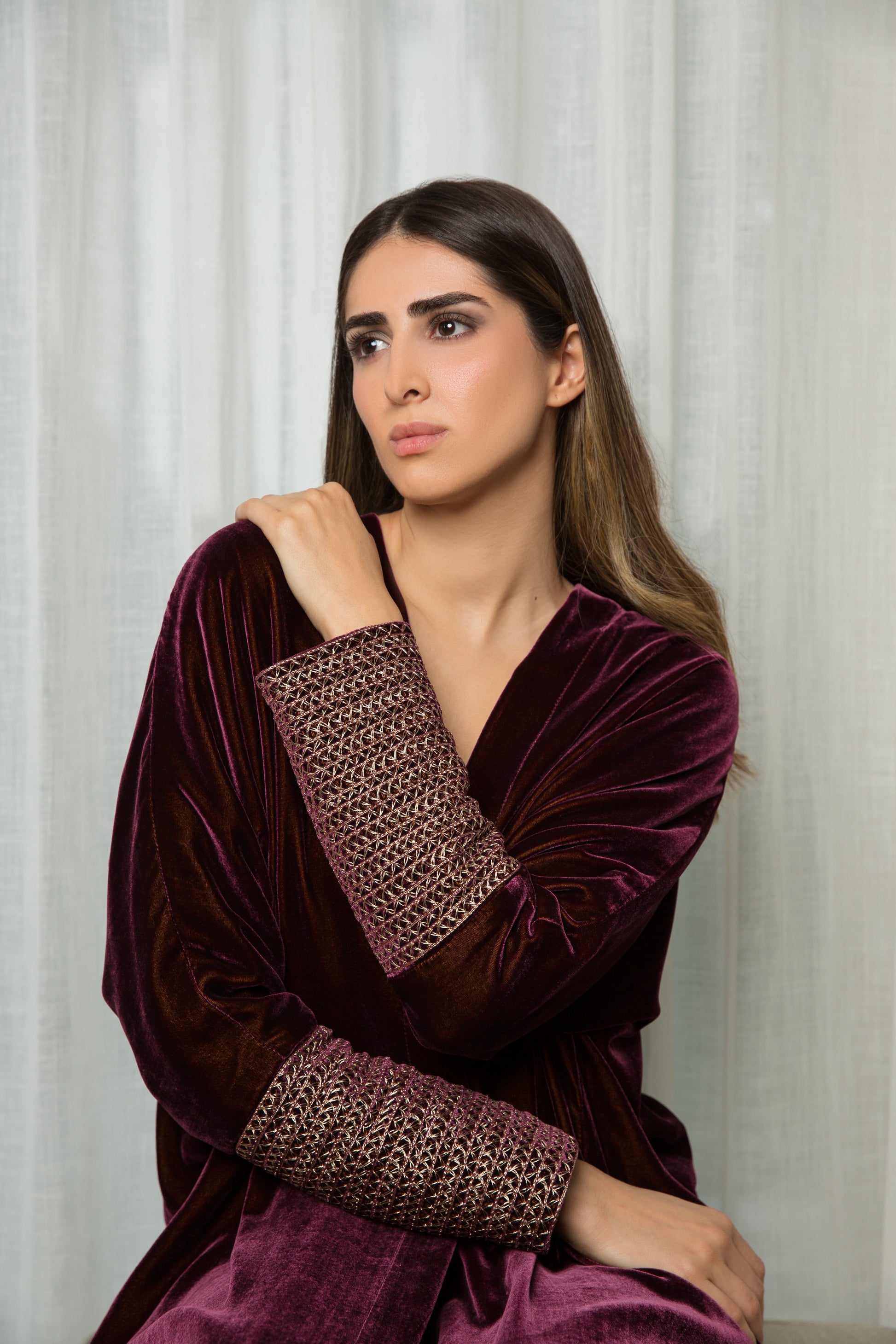Luxurious burgundy velvet abaya, exuding opulence and sophistication with its rich and vibrant colour.