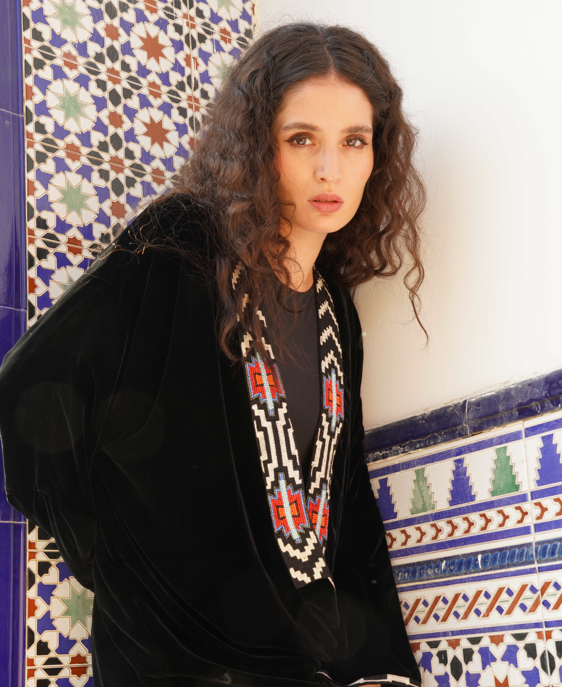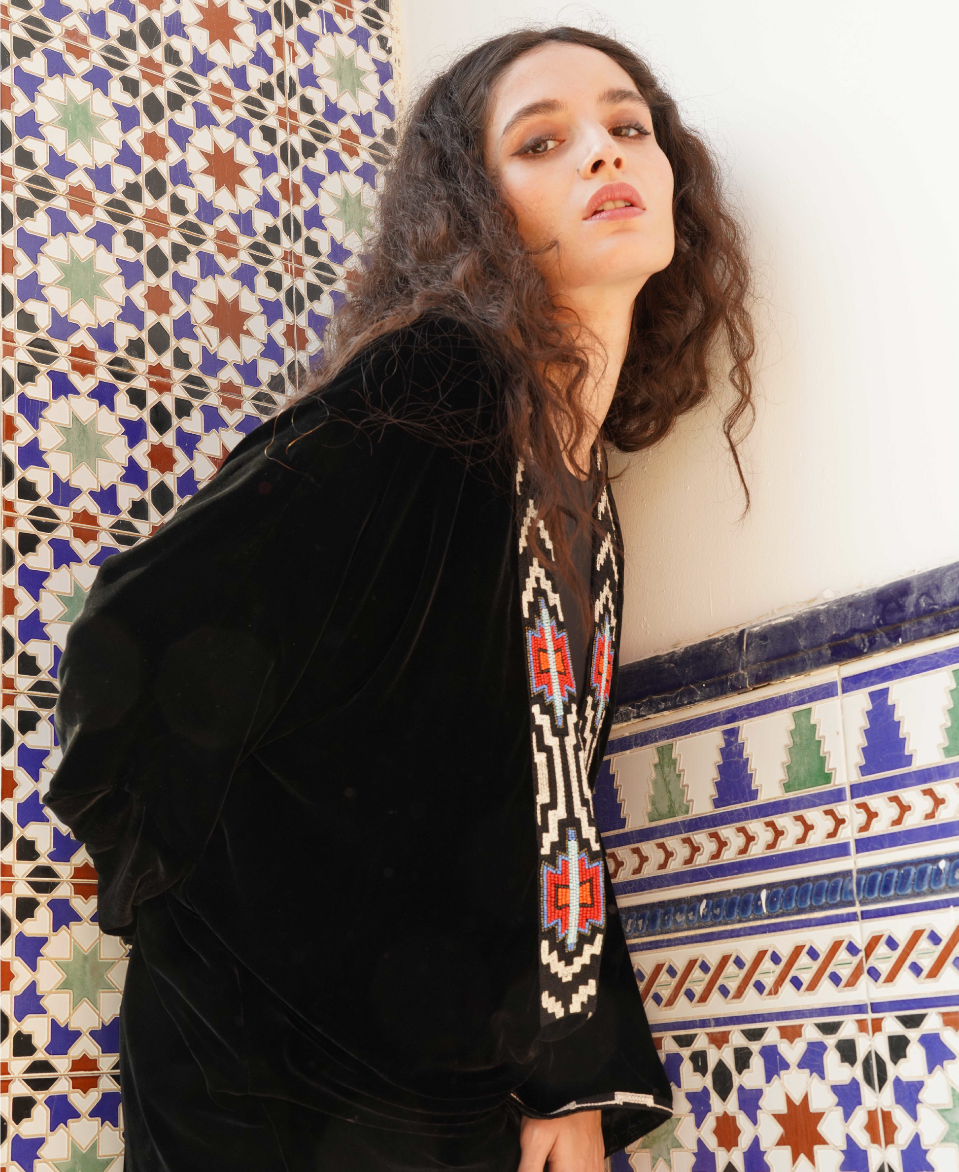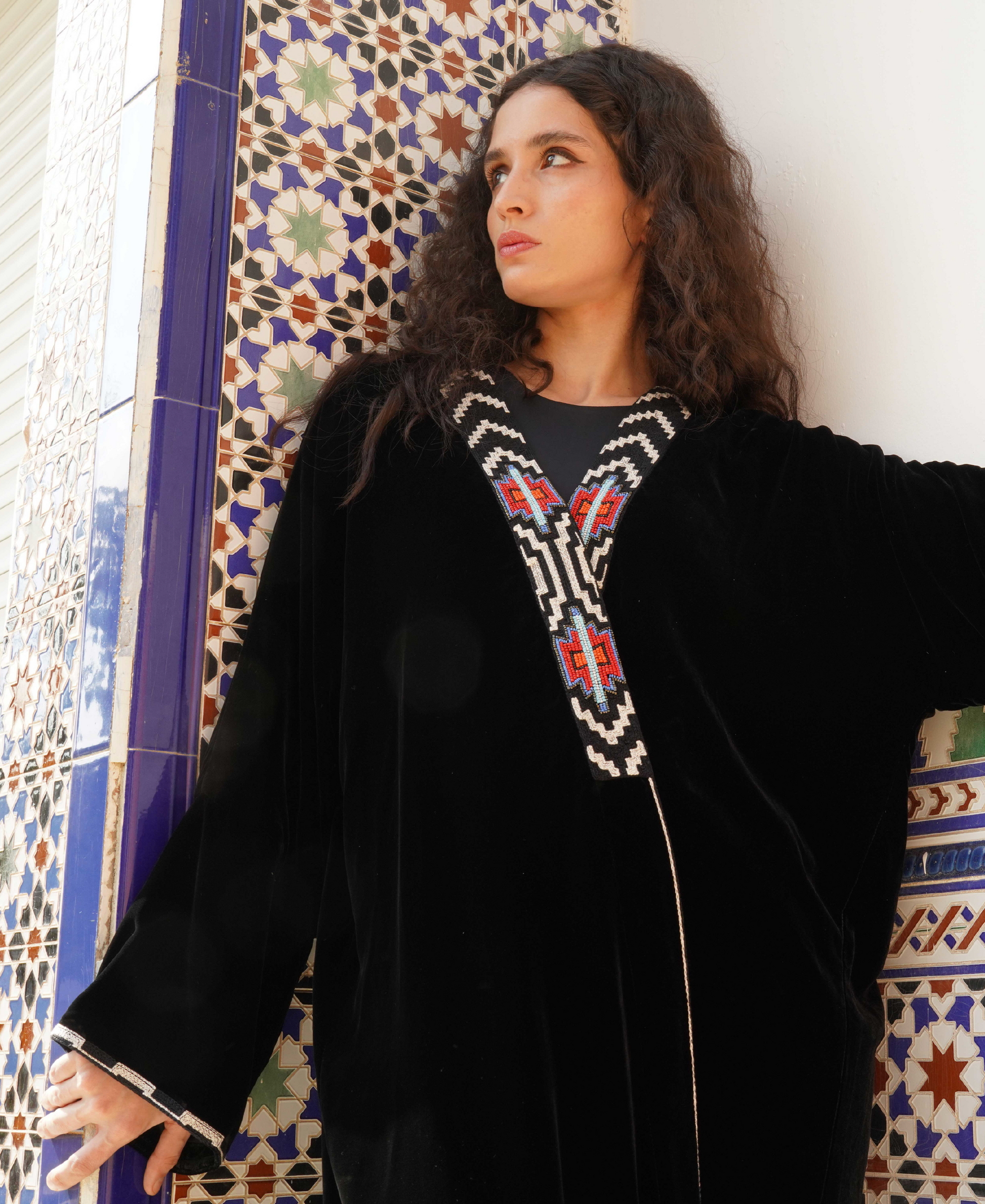 Crafted from luxurious velvet material, offering a plush and elegant texture that exudes sophistication with beautiful embroidery.