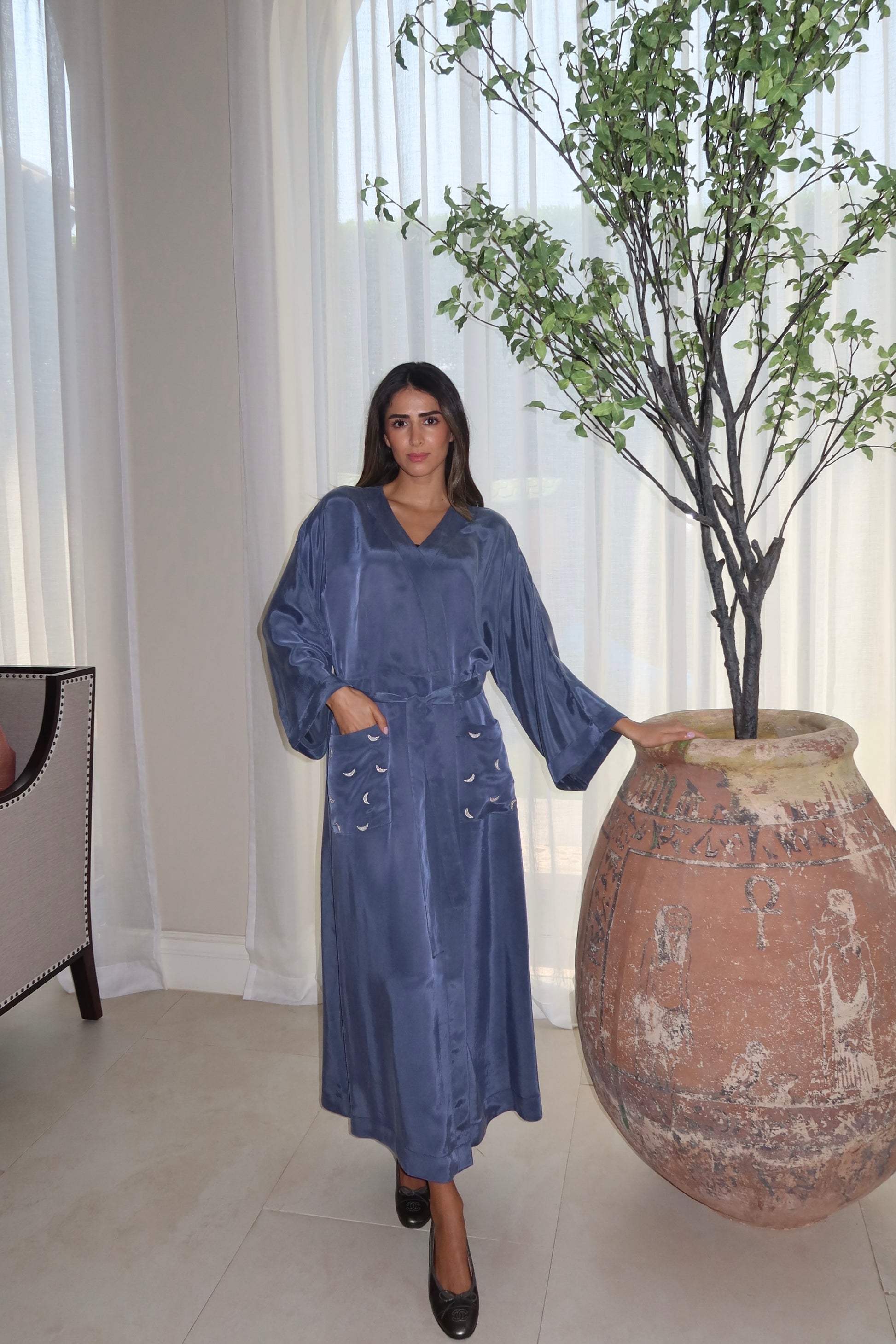 A statement of love woven into silk. This deep blue abaya features the words love you to the moon and back delicately written across the back.