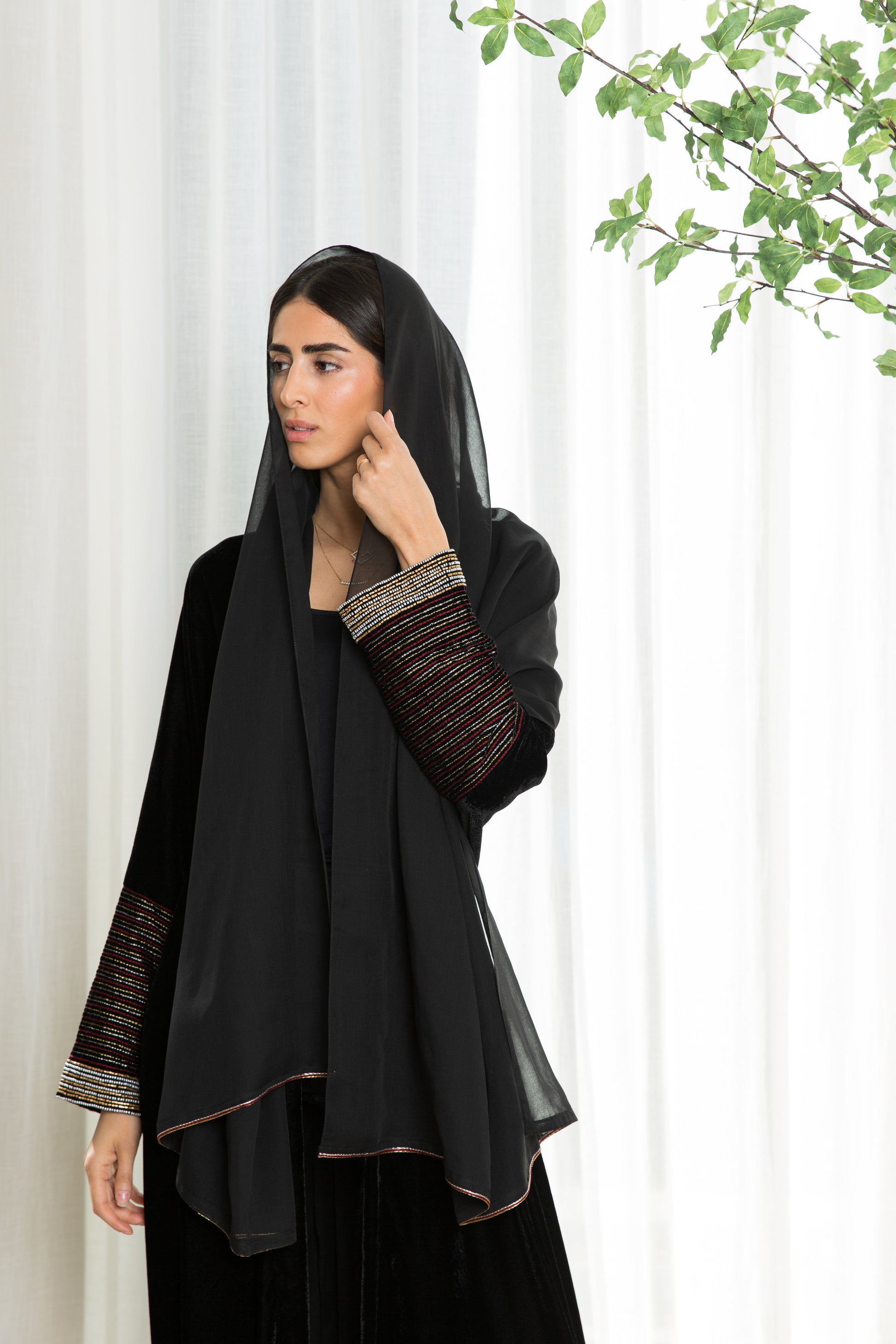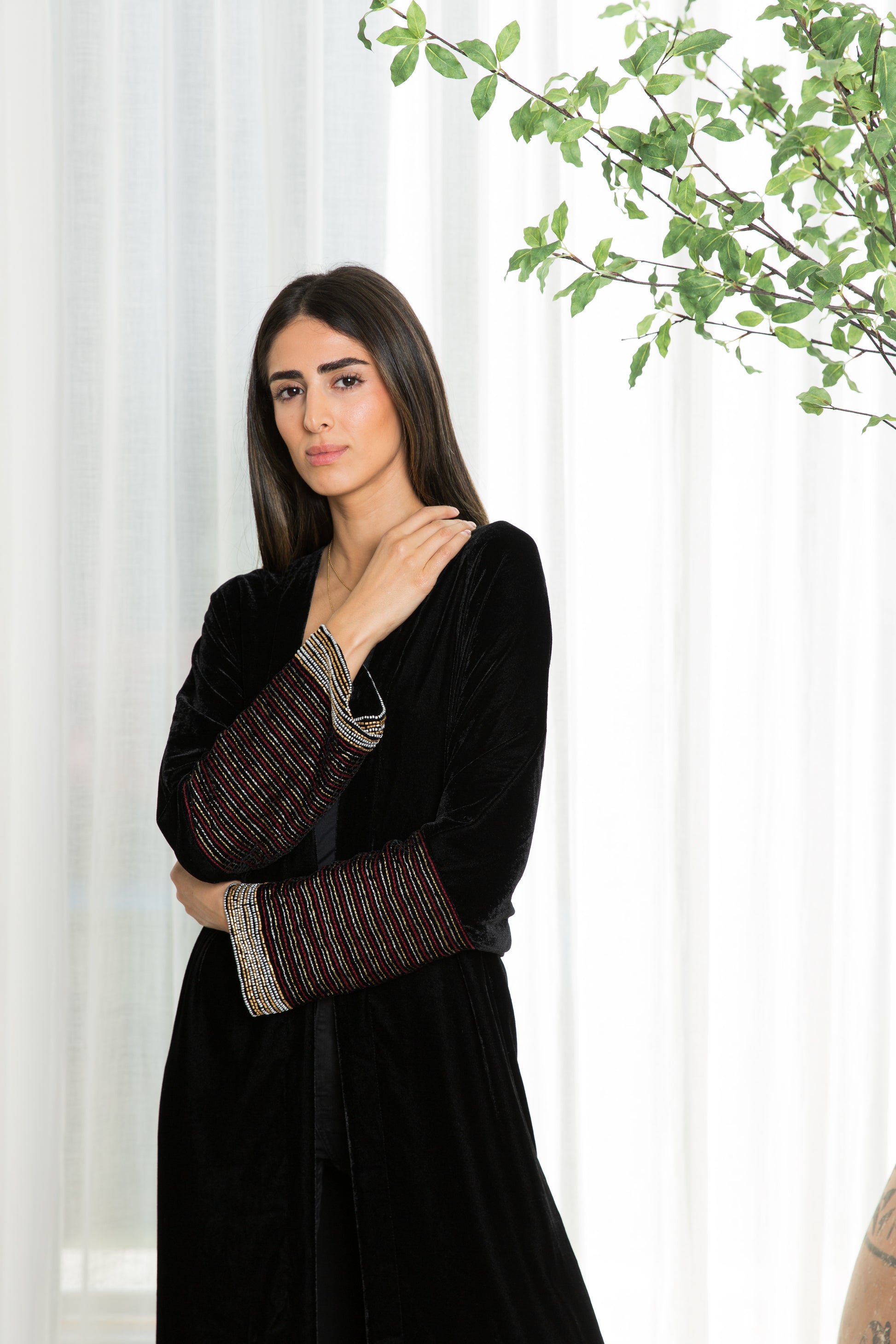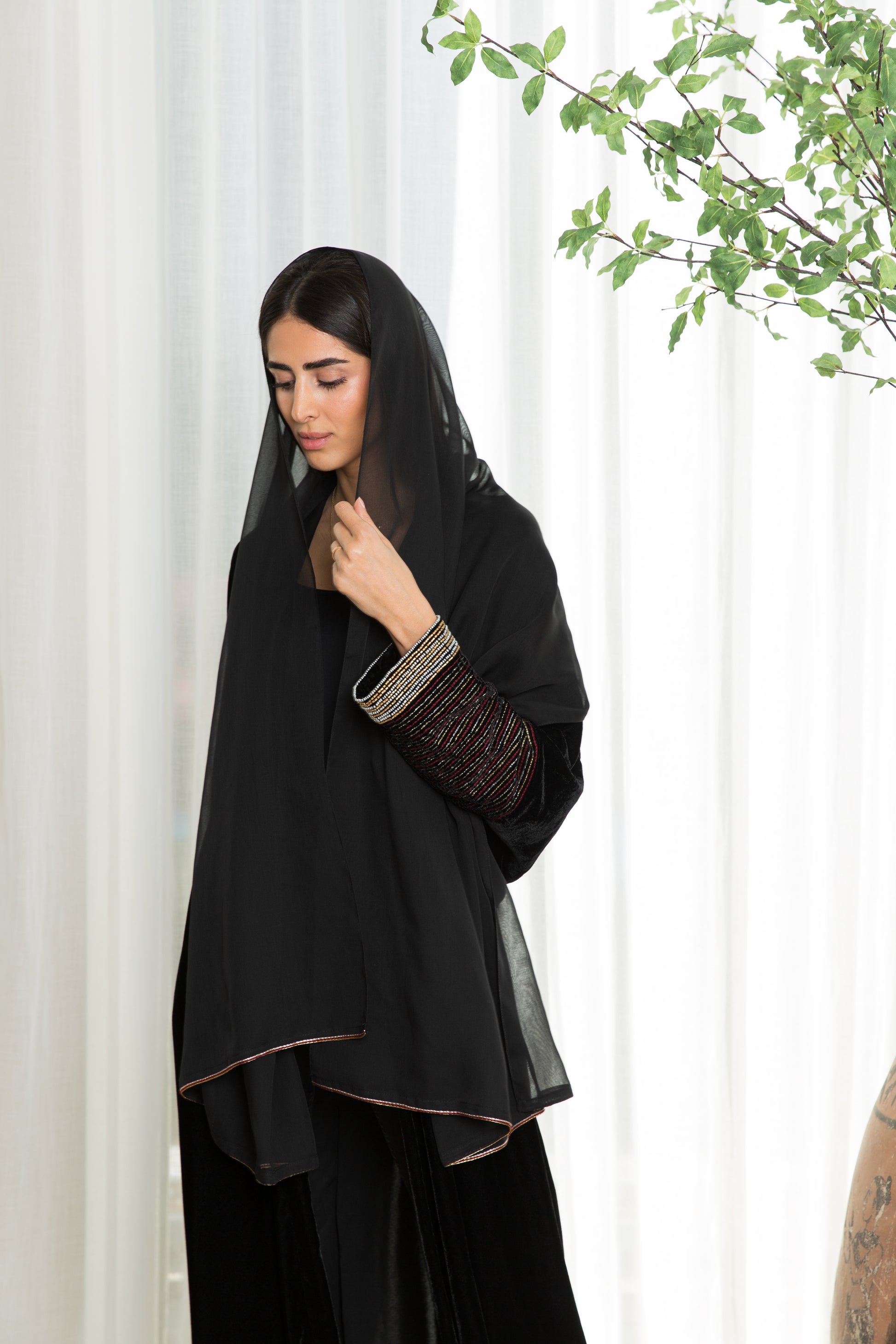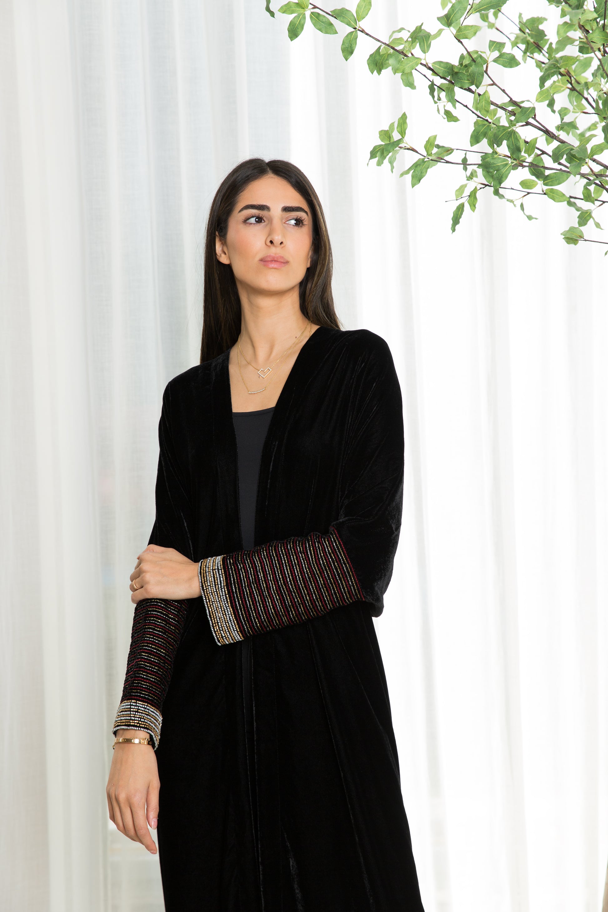 - Luxurious black velvet abaya, exuding opulence and sophistication with its rich and vibrant colour.