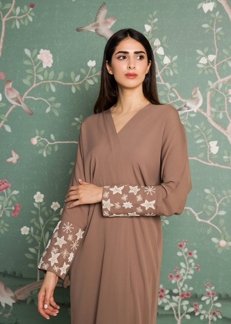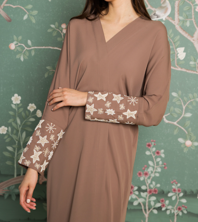 Each crepe abaya features intricate hand-designed stitching, showcasing artisanal craftsmanship and attention to detail.